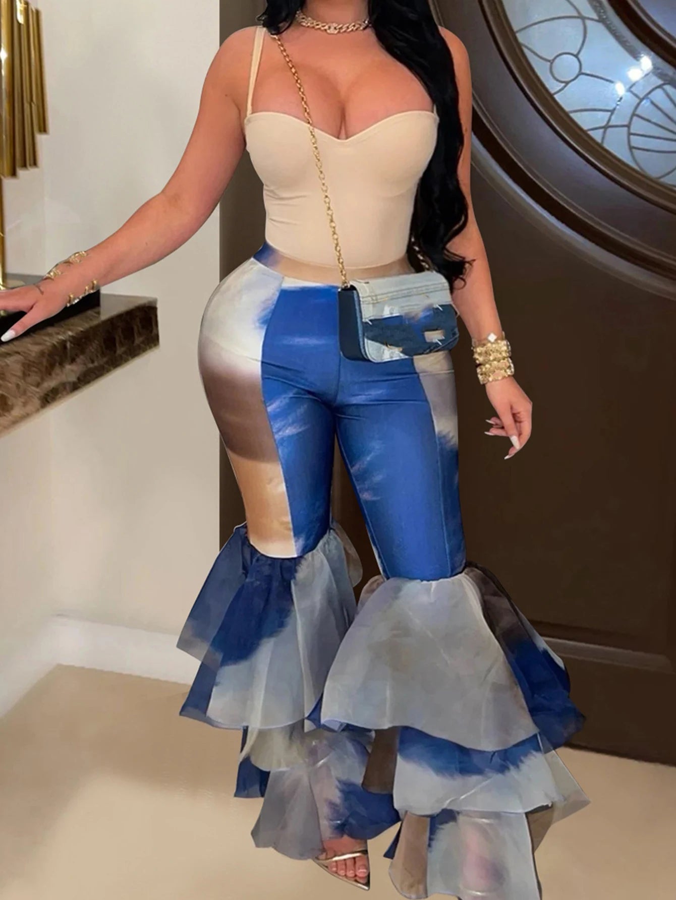 2115European and American women's fashion slim sexy ruffled mesh patchwork printed pants