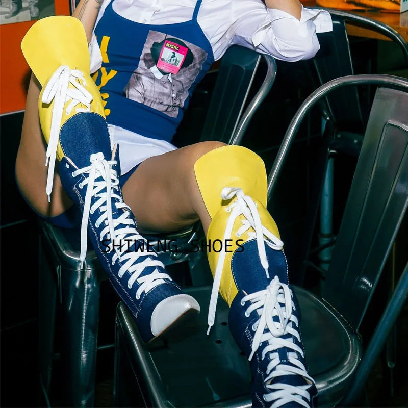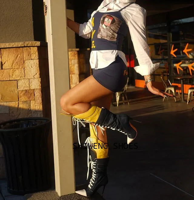 Cross Tied Patchwork Knee-High Boots Pointed Thin Heels Zipper Closure Sexy Runway Show Modern Booties Spicy Girl Newest 44