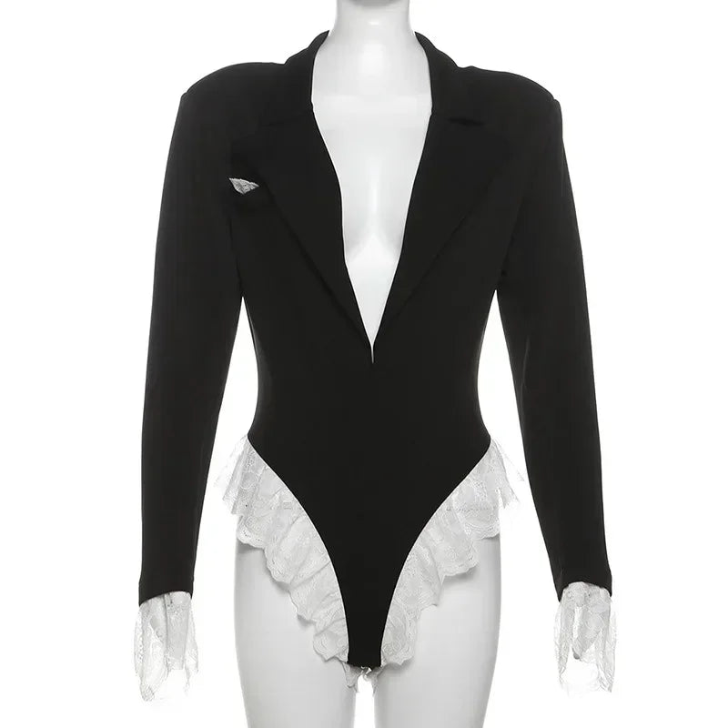 Lace V Neck Jumpsuit Women's Autumn Black Lapel Long Sleeve Jumpsuit Fashion Patchwork Ruffle Sexy Suit Women's Jumpsuit 2024