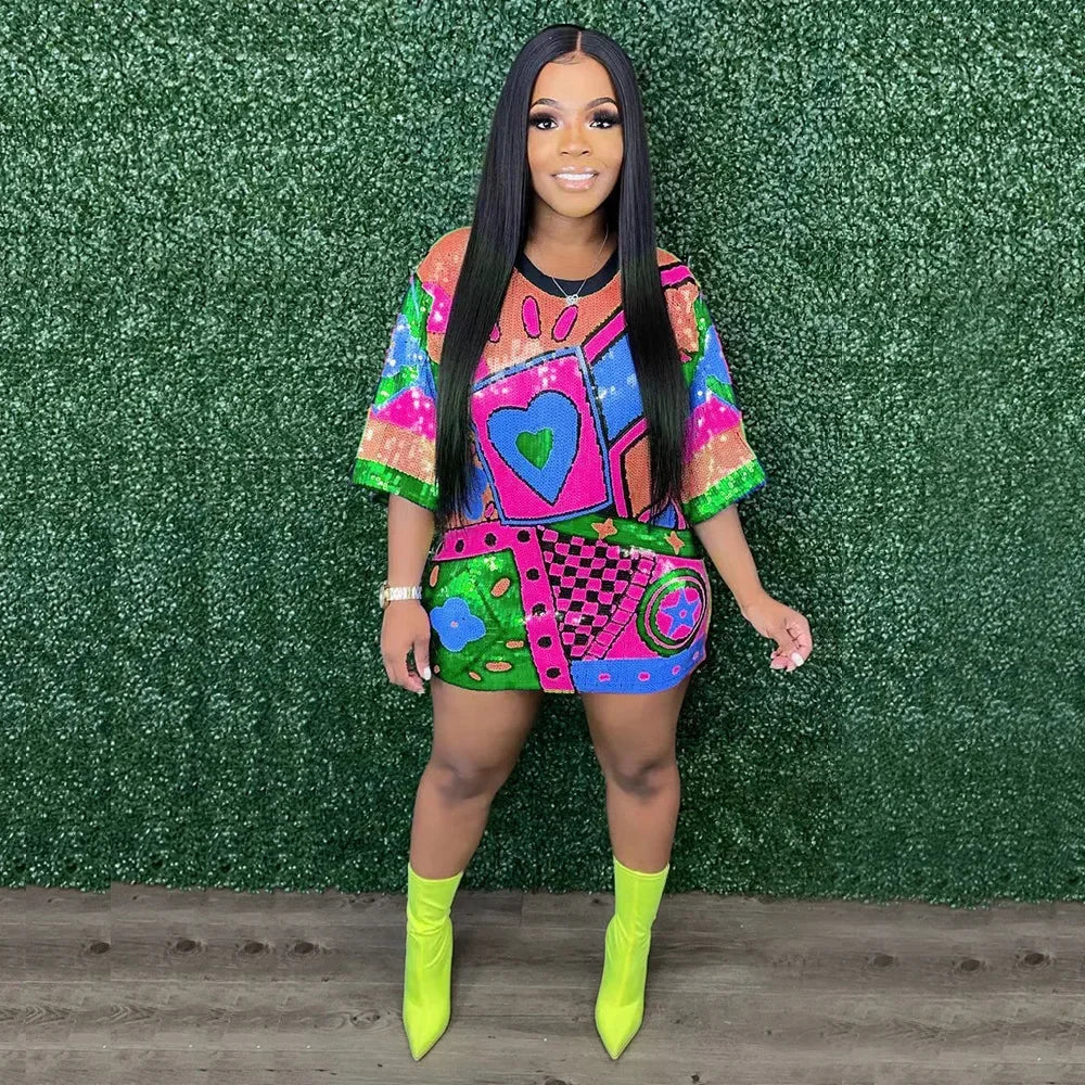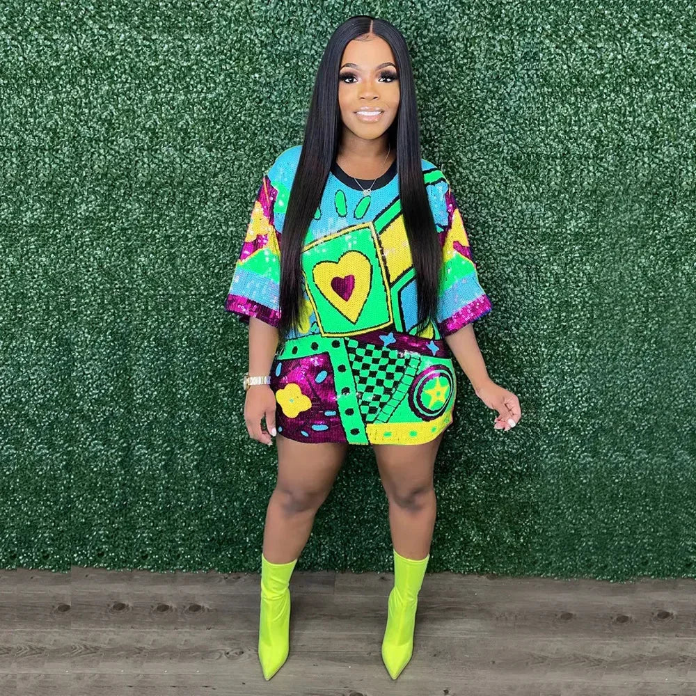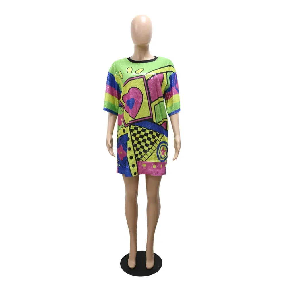Women O Neck Loose Mini Dress Shirt Fashion Casual Sequined Printed Long Sleeve Party Club Dress
